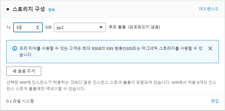 (프리티어 기간에는 30GB 사용 가능하므로 30G 선택