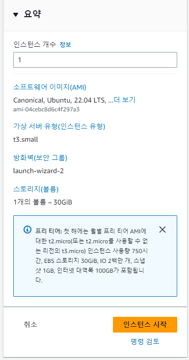 오른쪽 요약에 자신이 선택한 옵션을 최종 확인을 한 후 인스턴스 시작 [클릭]