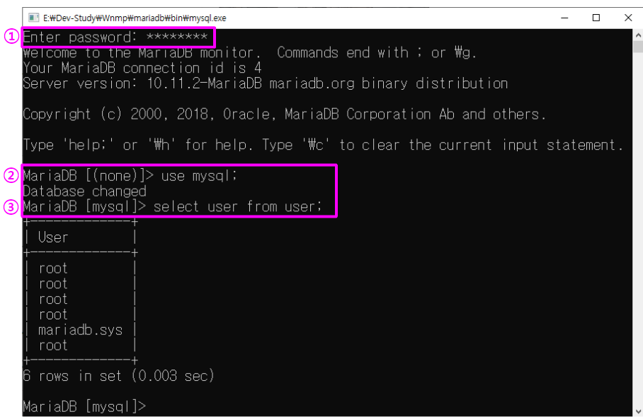 ③ select user from user; 명령어를 입력하고 위 결과처럼 나오면 잘 작동 되는 것이다.