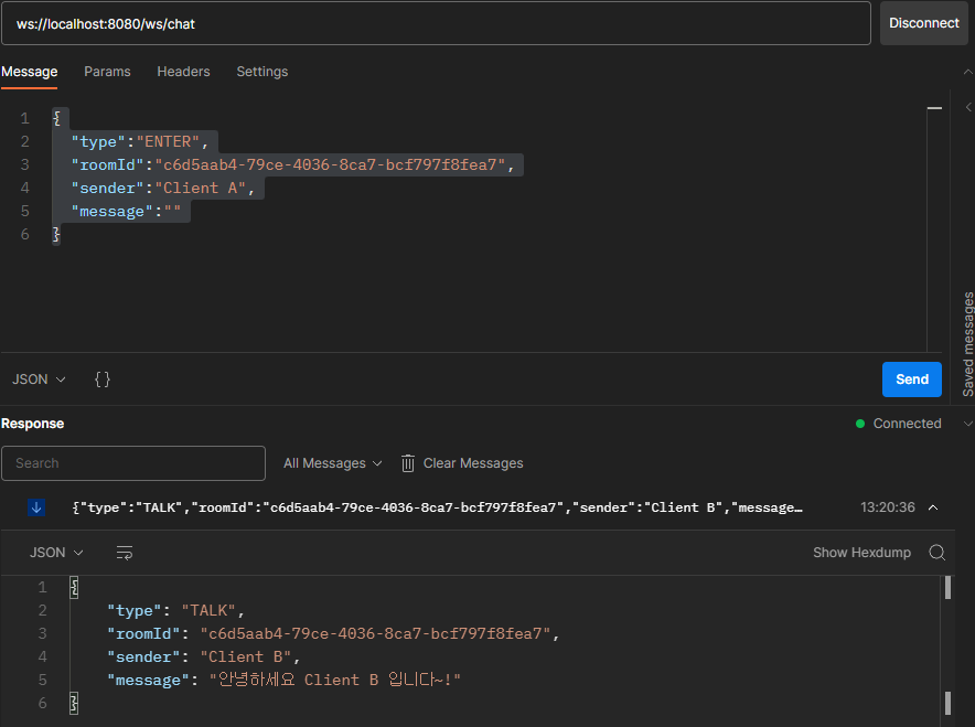 Client A의 Response를 확인해 보면 Client B가 보낸 채팅이 잘 전달된 것을 확인할 수 있다.