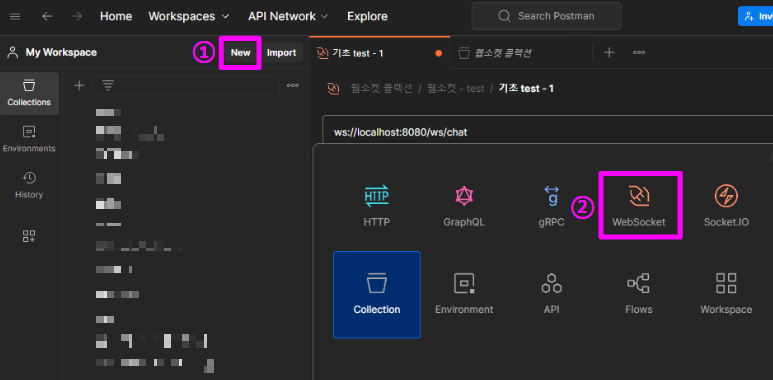 Postman을 실행 시킨 후 새로운 WebSocket Request를 생성해 준다.