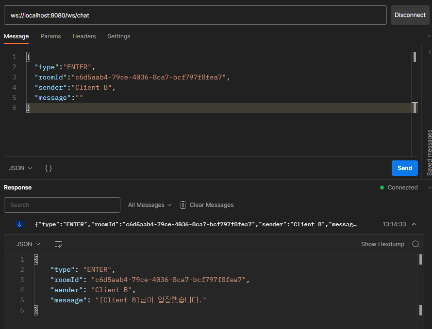위의 2.4에 나와있는 것처럼 Postman에서 새로운 WebSocket - Request를 생성해 주고 응답받은 채팅방의 고유번호를 가지고 채팅방에 입장한다.